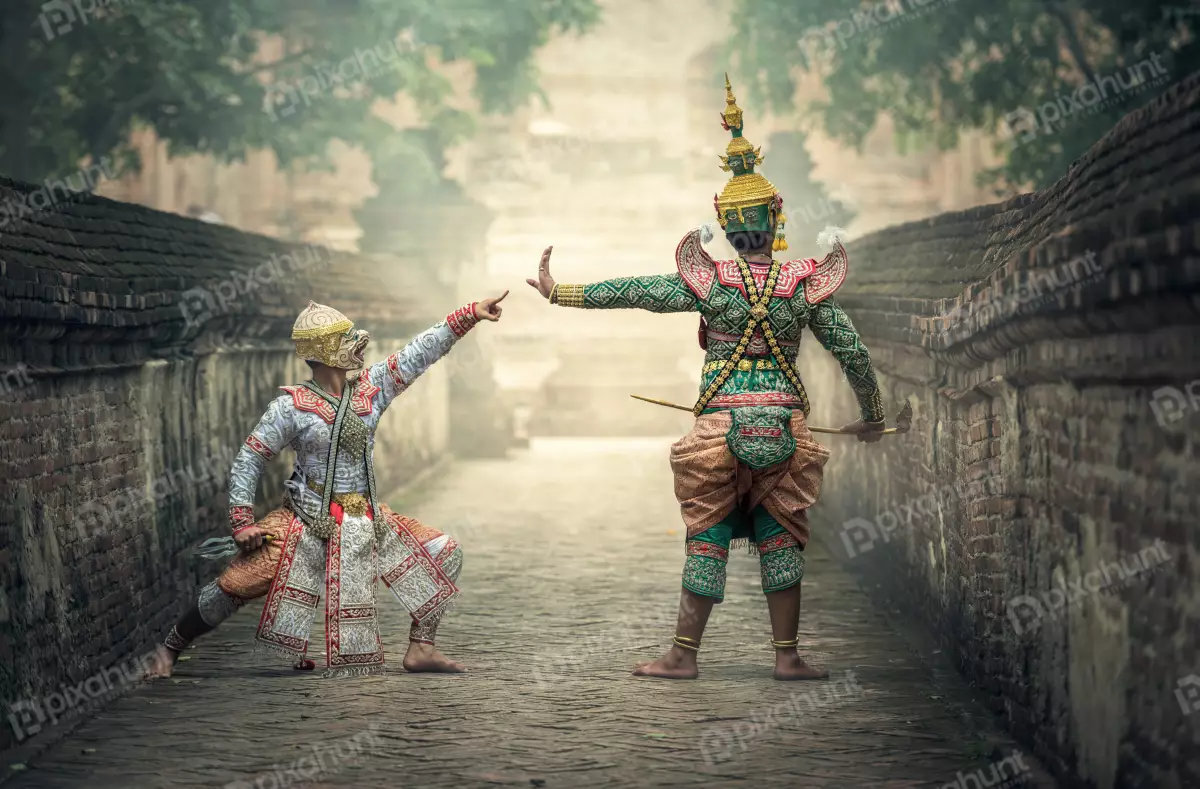 Two Thai dancers actors in traditional costumes performing a Khon dance