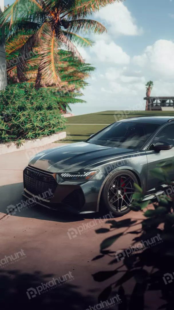 Dark gray Audi RS6 Avant parked on driveway with tropical backdrop