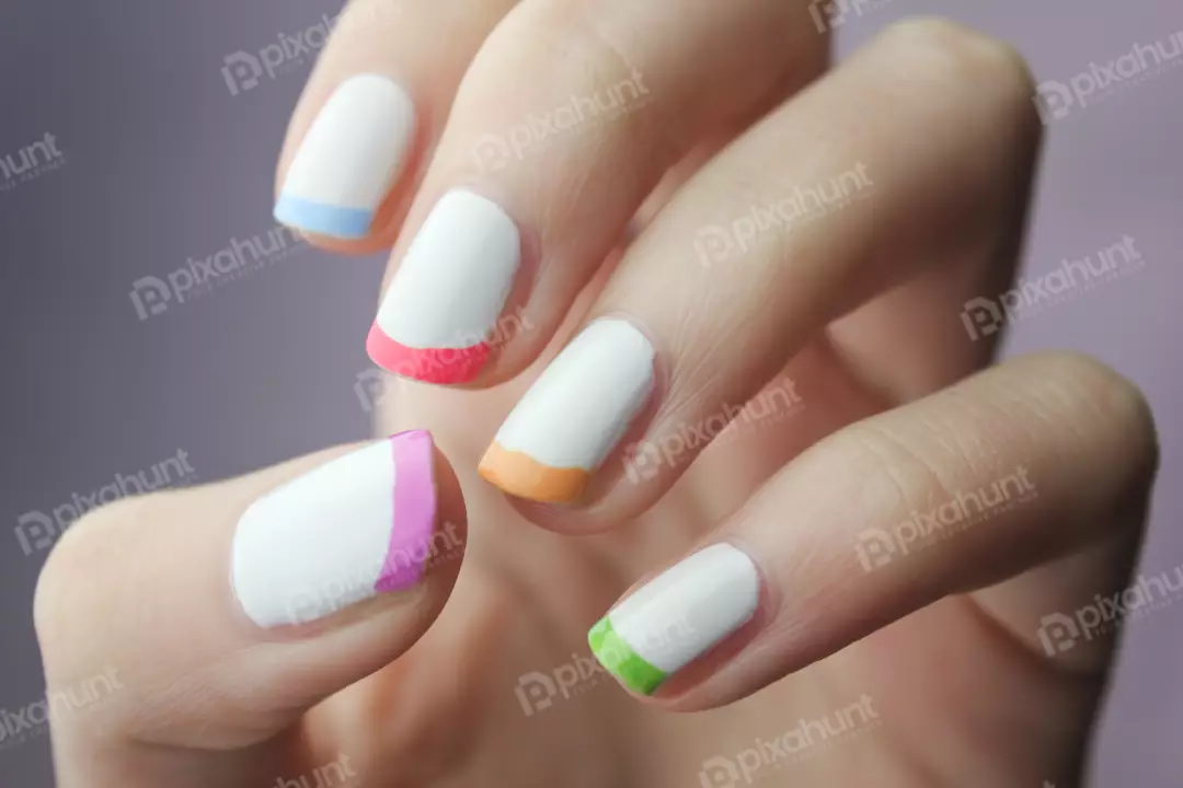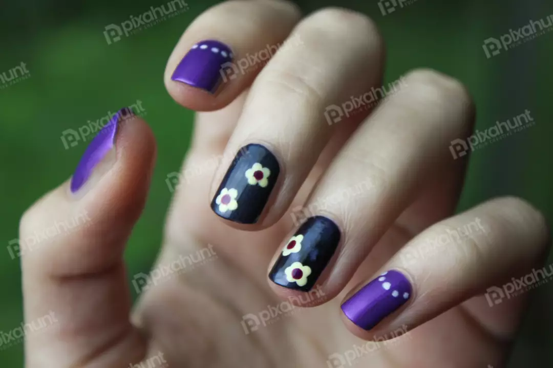a hand with a dark purple painted thumb and middle finger, with the index and pinkie painted a lighter shade of purple