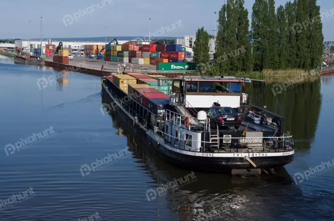 A large ship in a river ship is carrying a variety of containers and there are trees and buildings