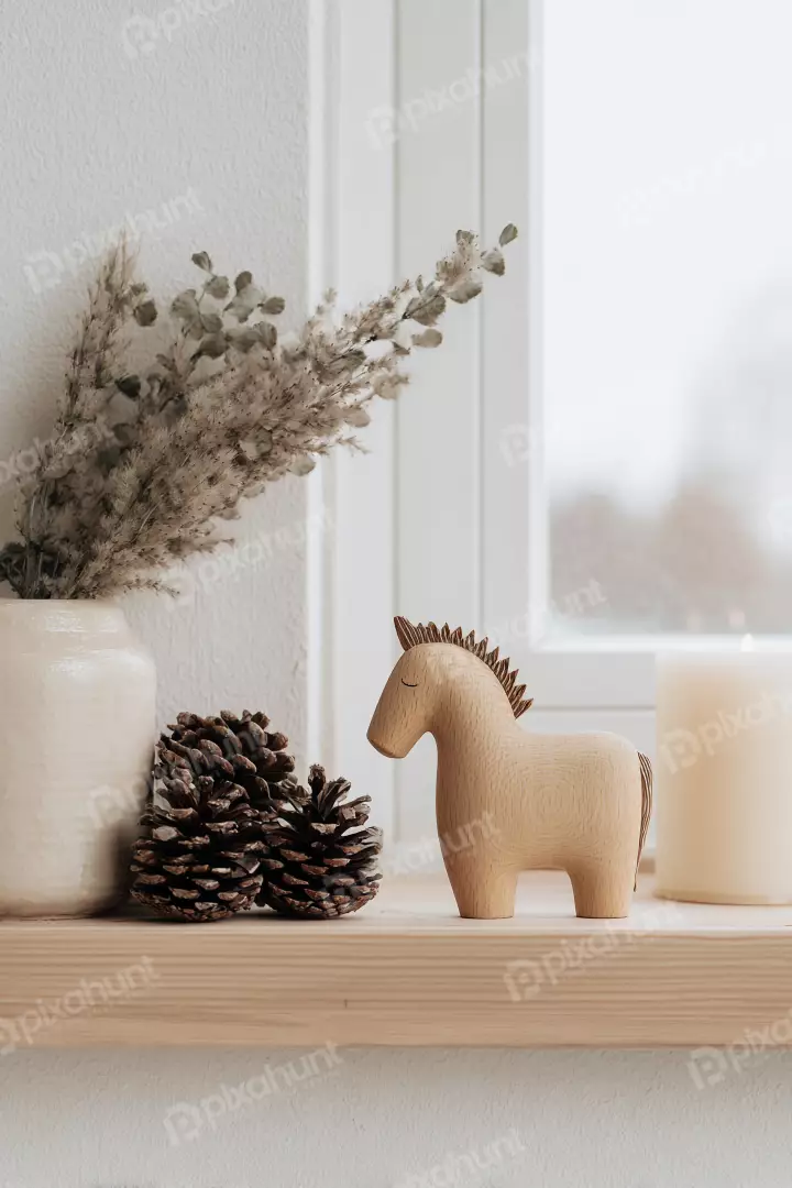 Wooden horse toy, pinecones, and candle on a shelf