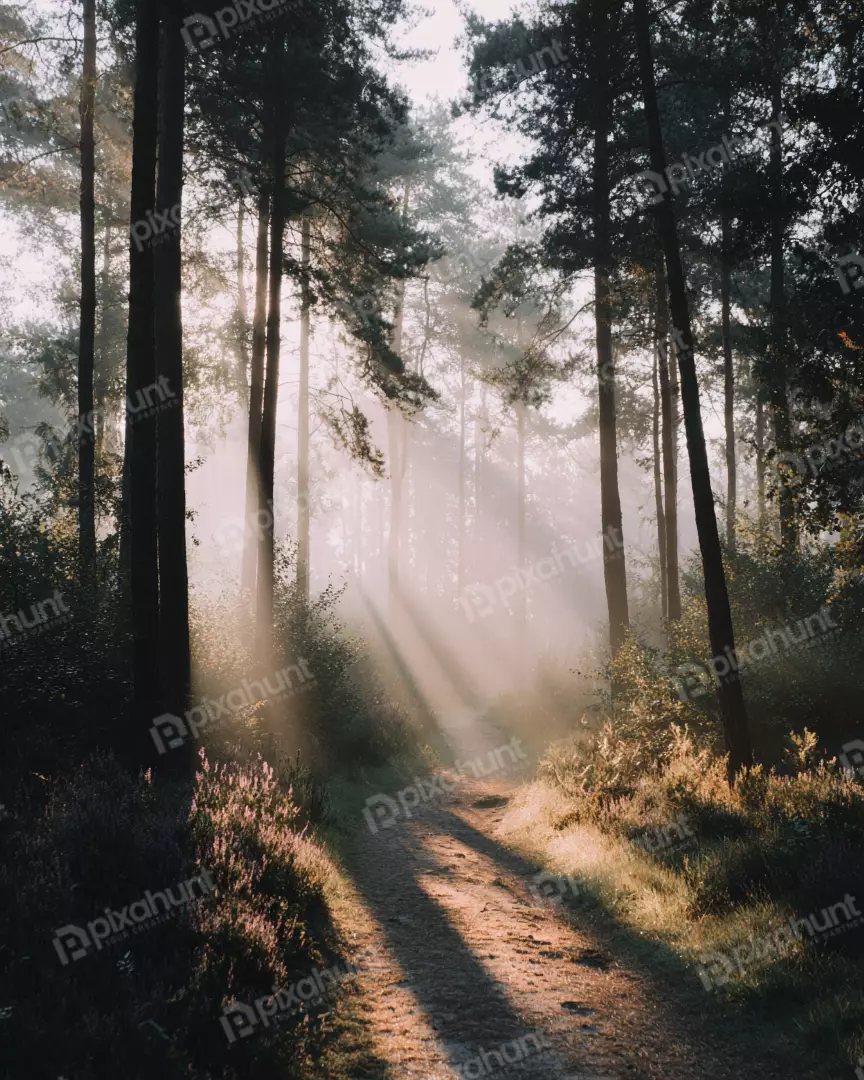 Golden Sunbeams Pierce Ethereal Mist on a Tranquil Forest Path at Sunrise