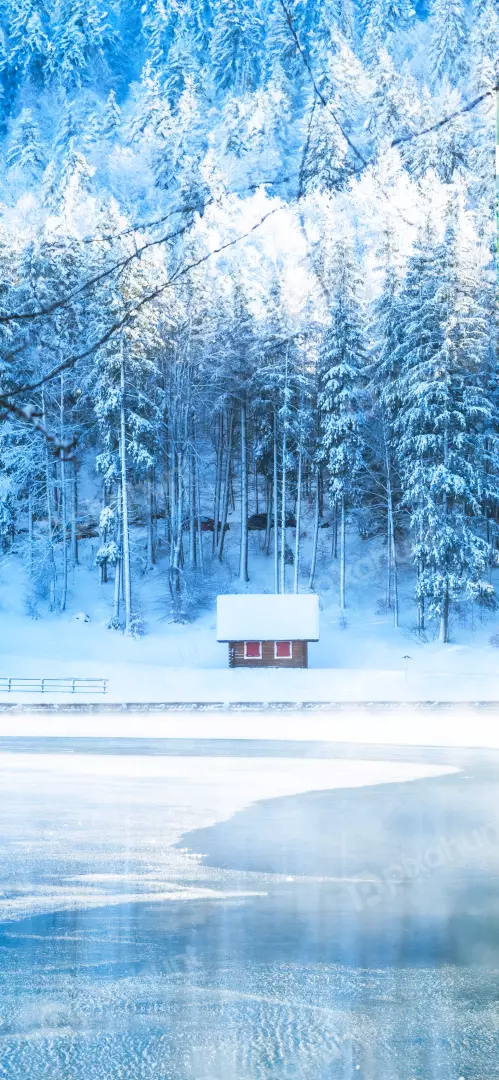 Cozy Wooden Cabin by Frozen Lake Surrounded by Snow-Covered Forest