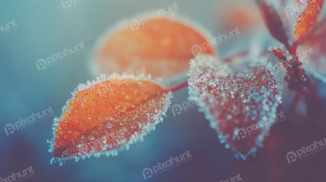 Frosted Autumn Leaves with Shimmering Ice Crystals Against a Soft Blue Background