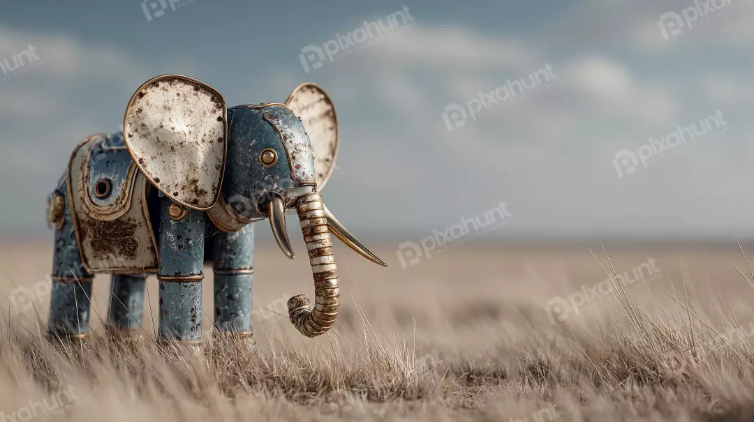 Industrial Steampunk Elephant Robot with Golden Tusks in Arid Grassy Landscape