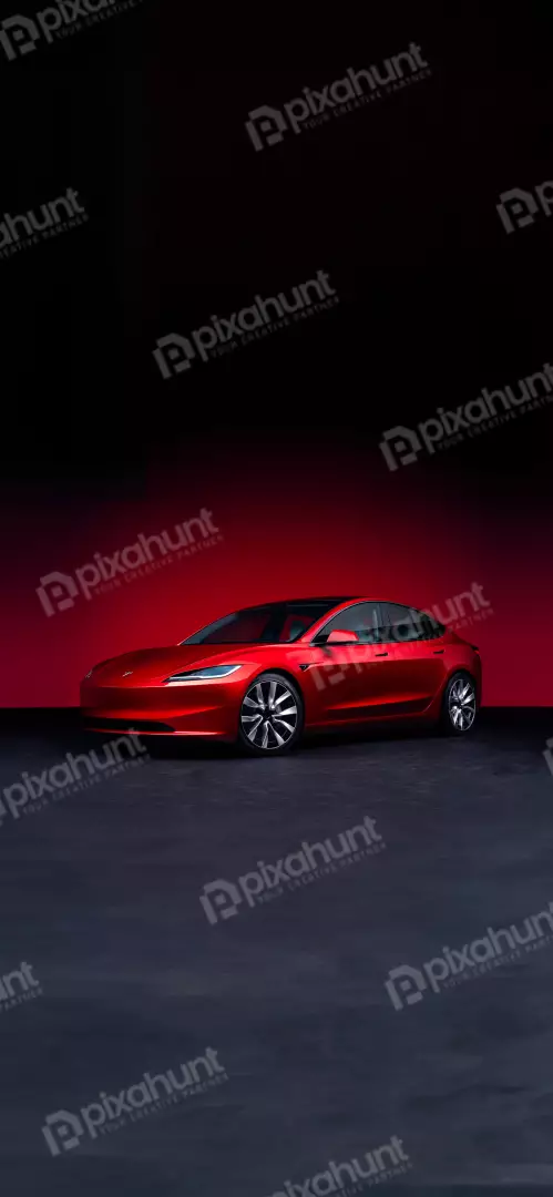 Sleek Red Tesla Sedan Showcased Against Dark Background