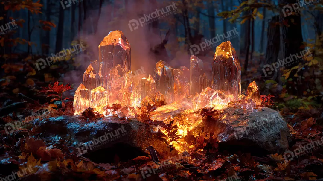Mystical glowing crystals illuminate autumn forest leaves with warm light at dusk