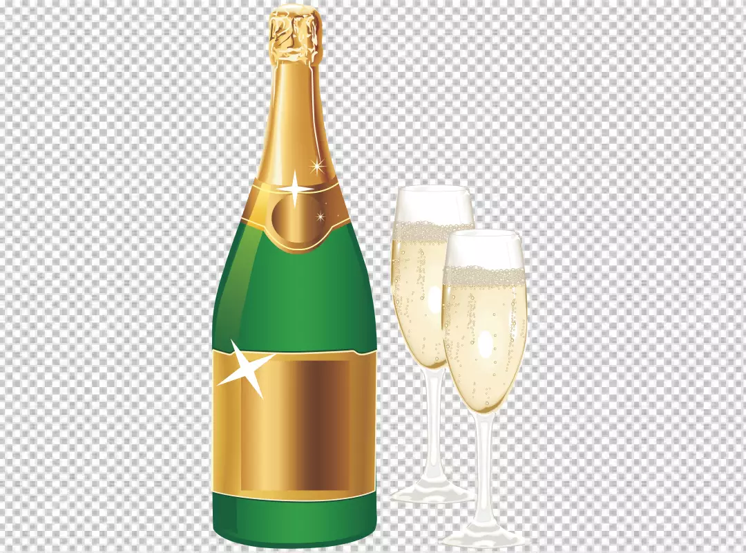 Champagne bottle in ice bucket and two full glasses realistic transparent background