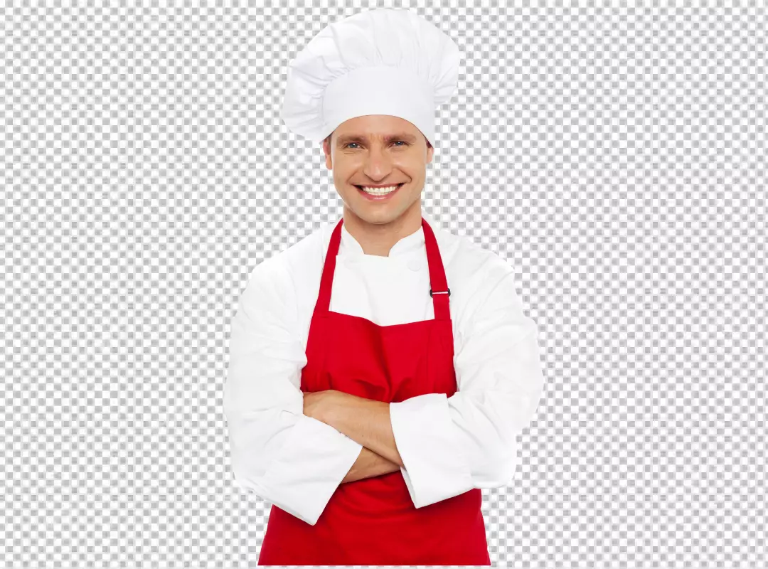A happy young bearded chef man in white uniform smiling and holding his hands together on an PNG