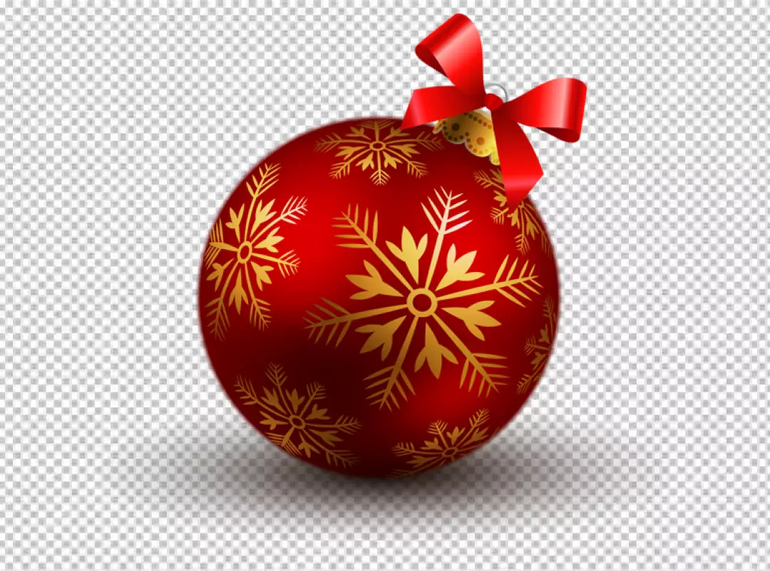 A shiny red Christmas bauble with gold swirls and patterns isolated on PNG transparent background