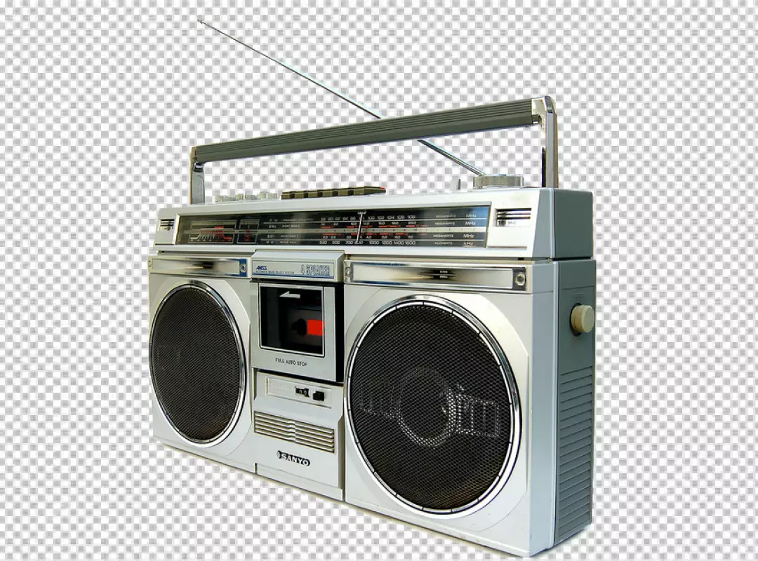 Silver retro boombox stereo cassette player boombox has a black handle on top and a black antenna on the left side