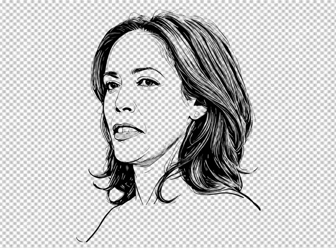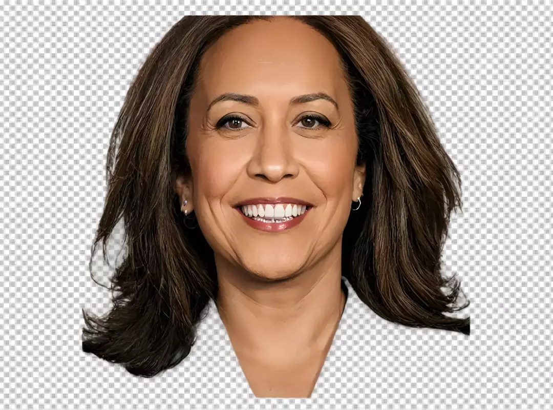 Kamala Harris is wearing a dark blue suit and a white blouse