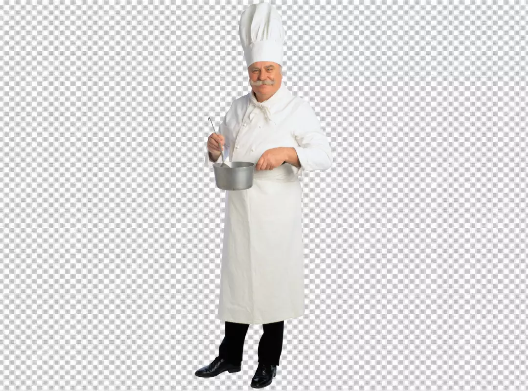 A happy young bearded chef man in white uniform smiling and holding his hands together on an PNG