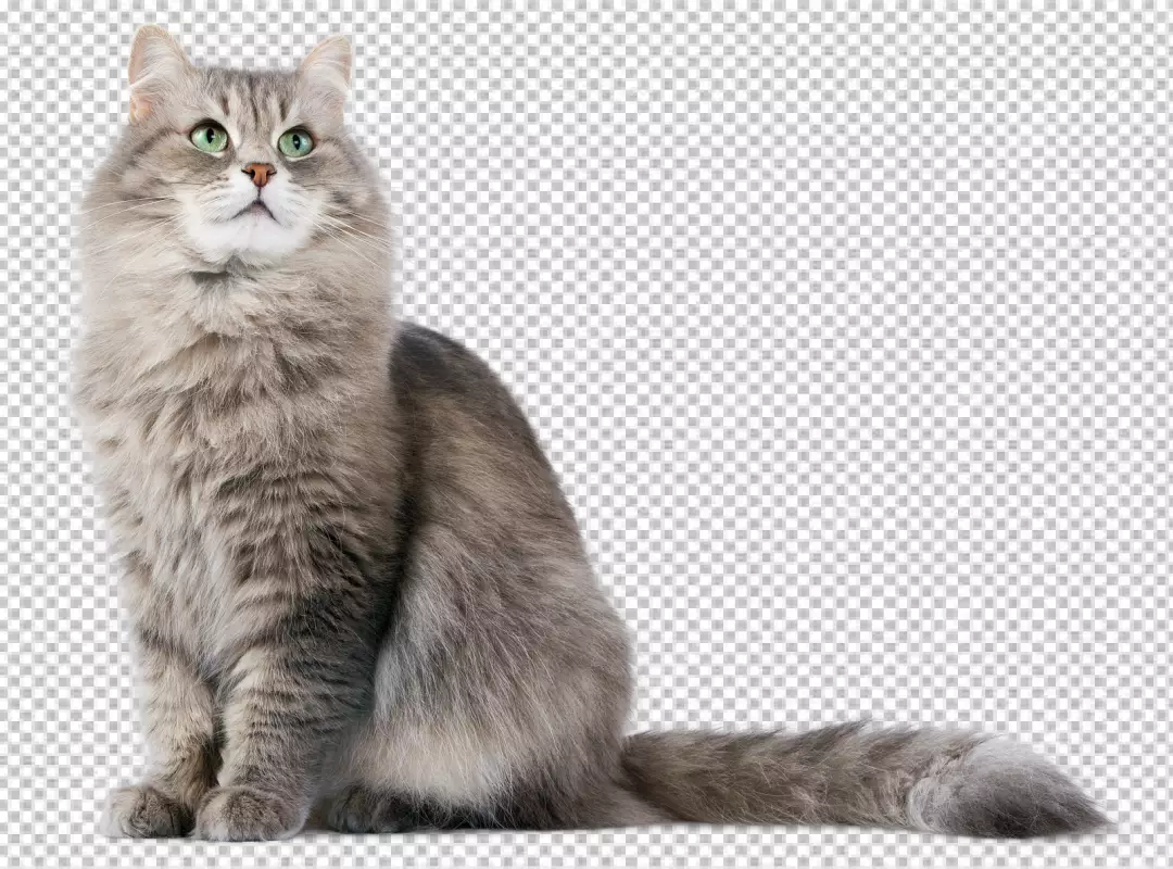 Studio portrait of tabby cat standing on back two legs with paws up against a transparent backdrop