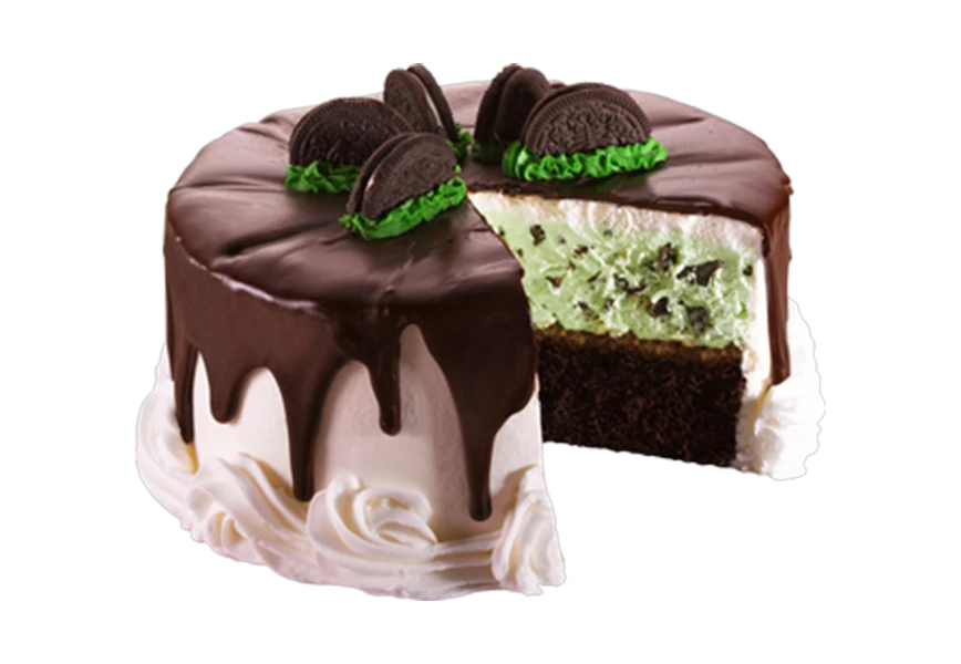 Cake poured with chocolate and decorated with different cookies on a transparent background