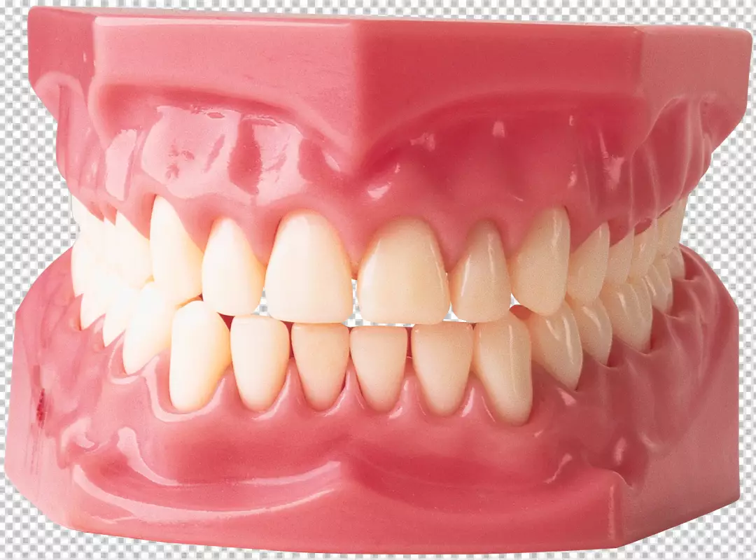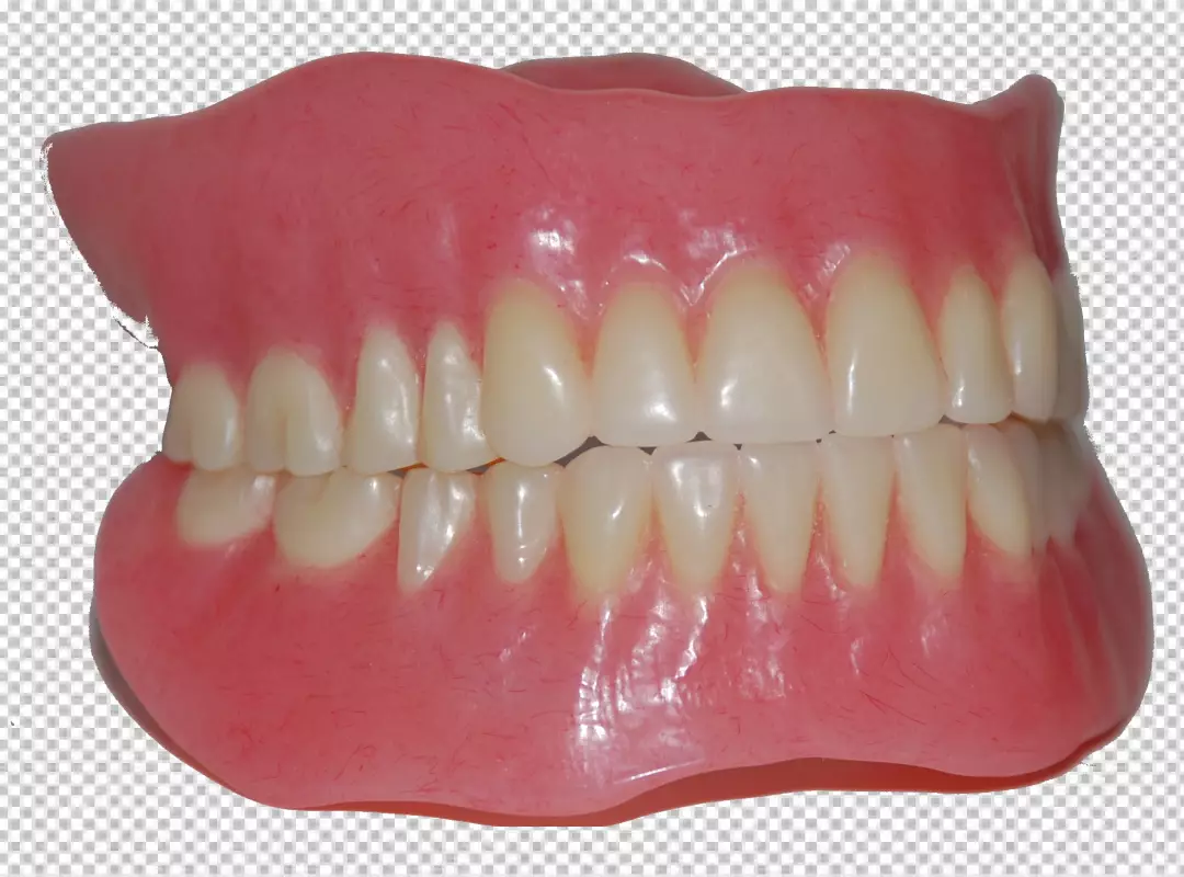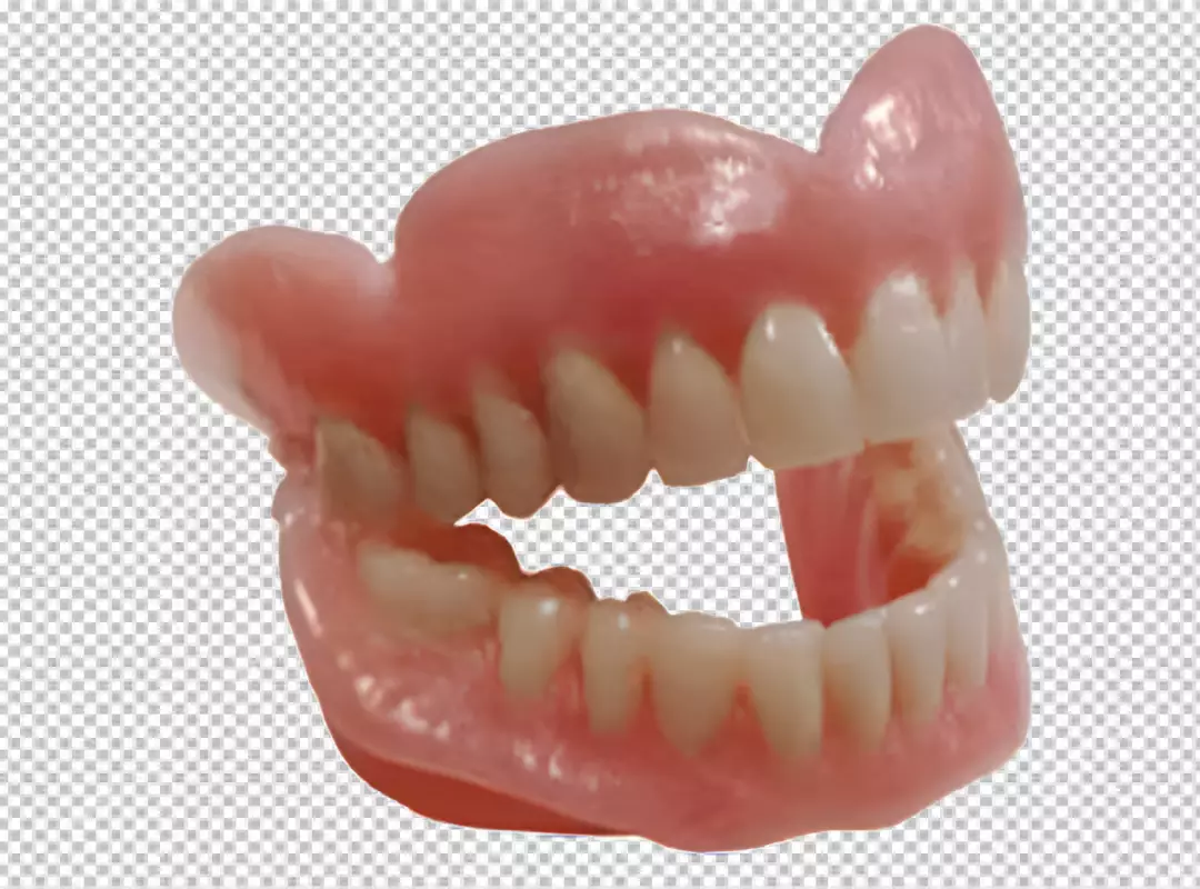 The dentures are made of a pink acrylic material and have a full set of teeth