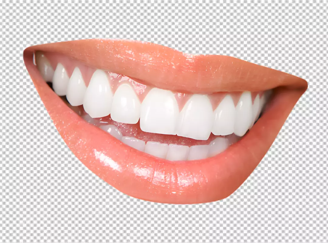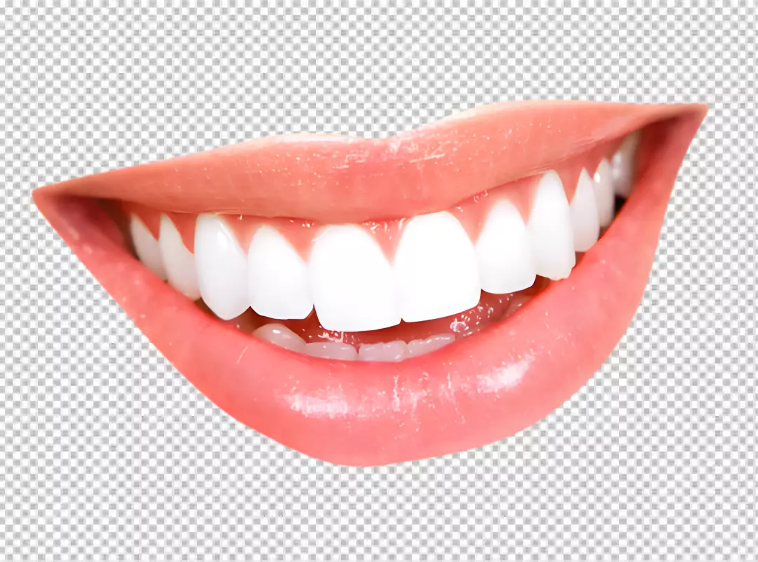 a close-up of a woman's smile also teeth are white and her lips are pink and healthy looking