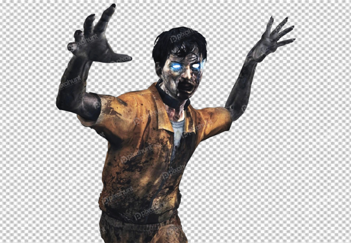 The zombie is in a prison jumpsuit and has its hands raised in the air