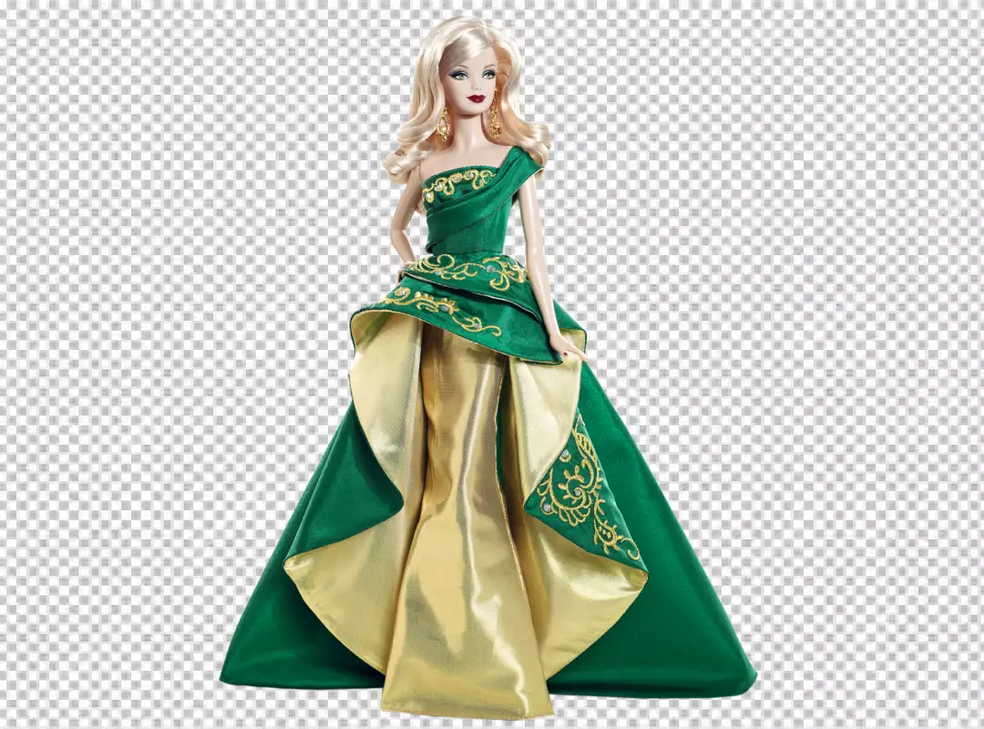 Barbie doll wearing a green and gold dress