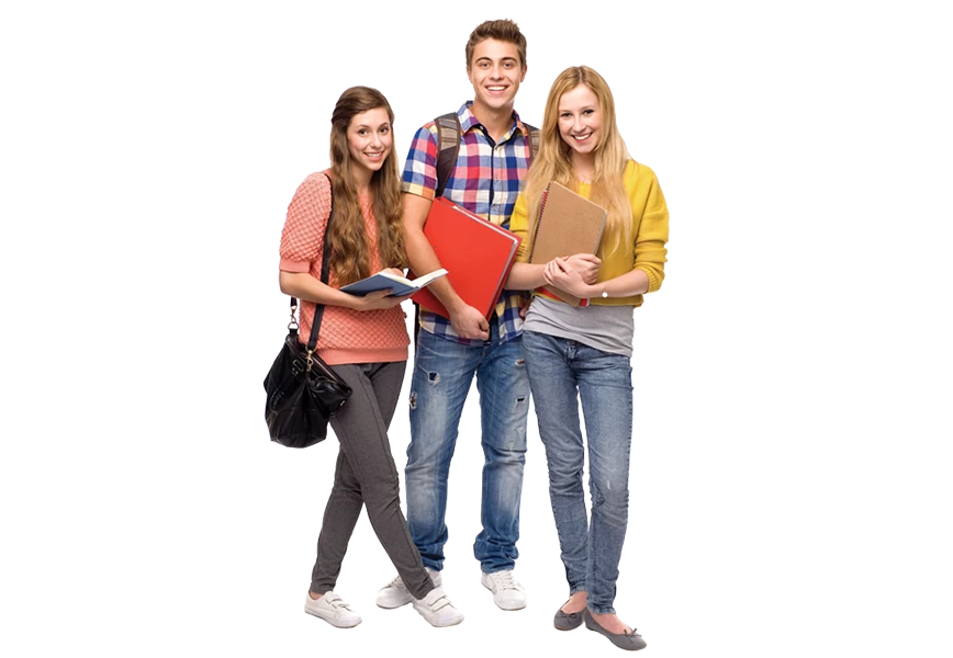 Happy child school girl with backpack and book in her hands isolated on transparent background png