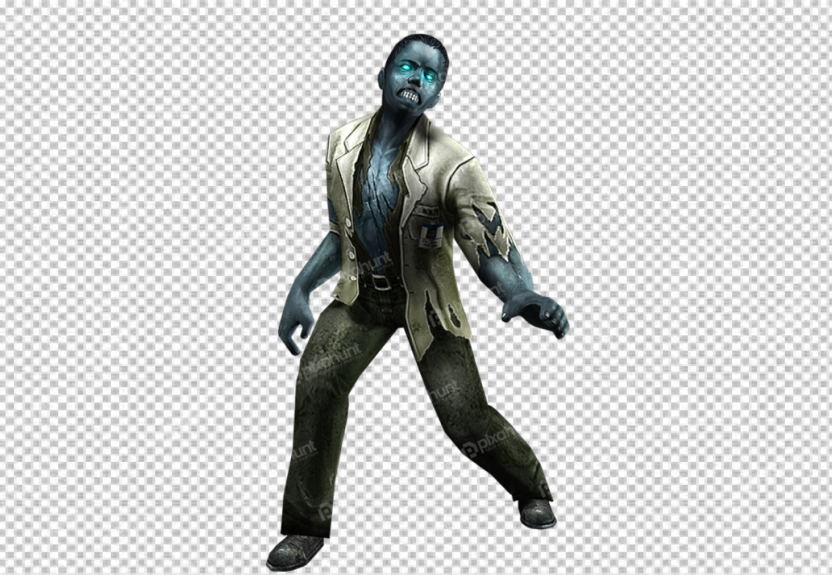 The zombie is wearing a white lab coat, blue pants, and brown shoes