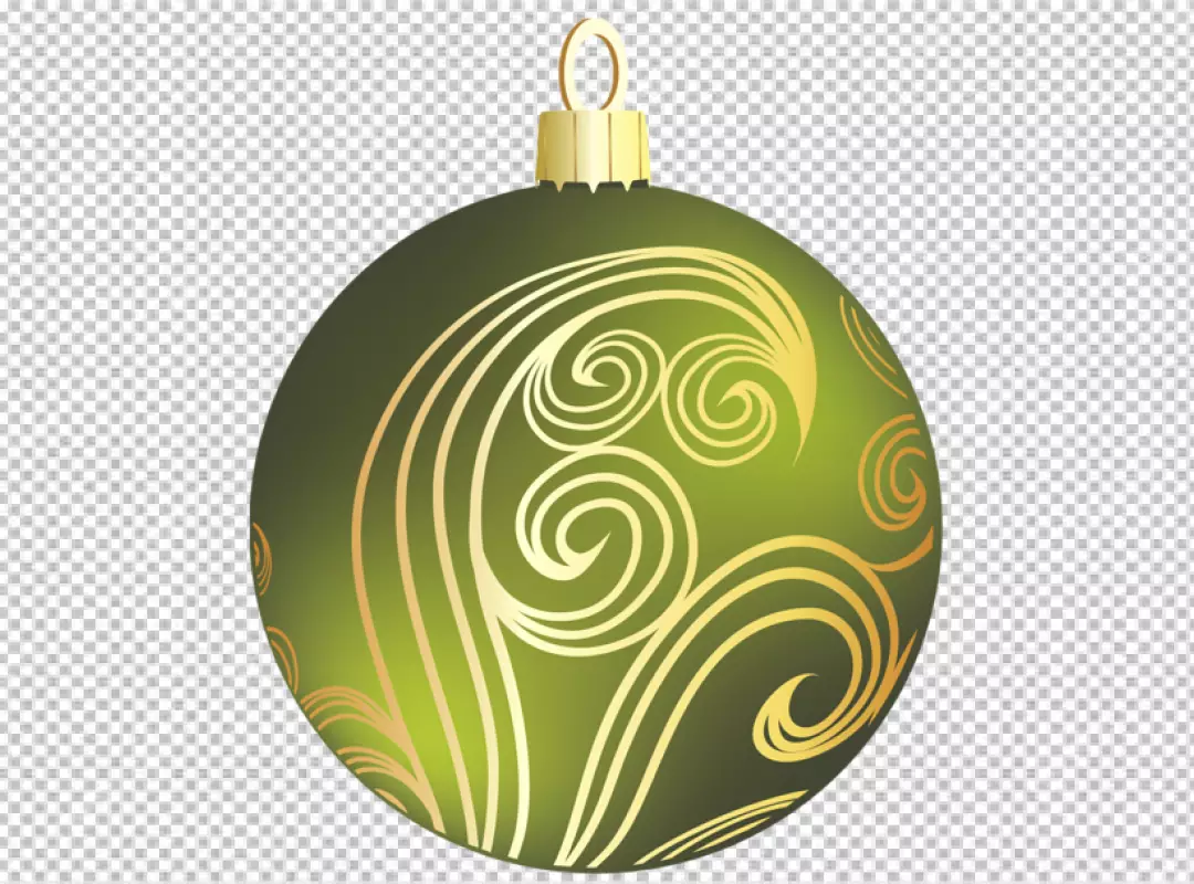 A shiny red Christmas bauble with gold swirls and patterns isolated on PNG transparent background