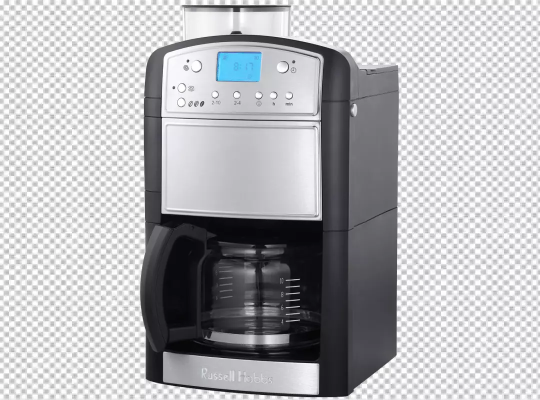A coffee maker with a silver on transparent background