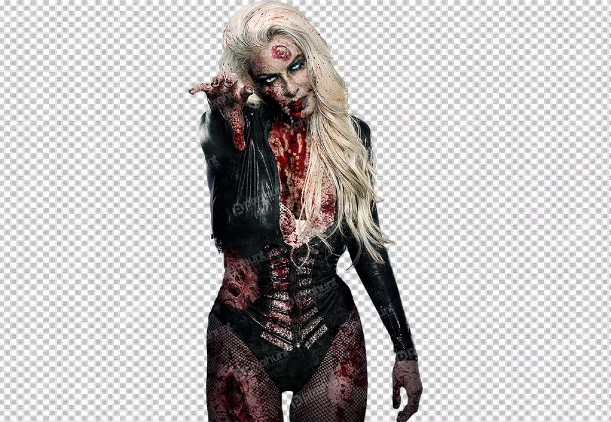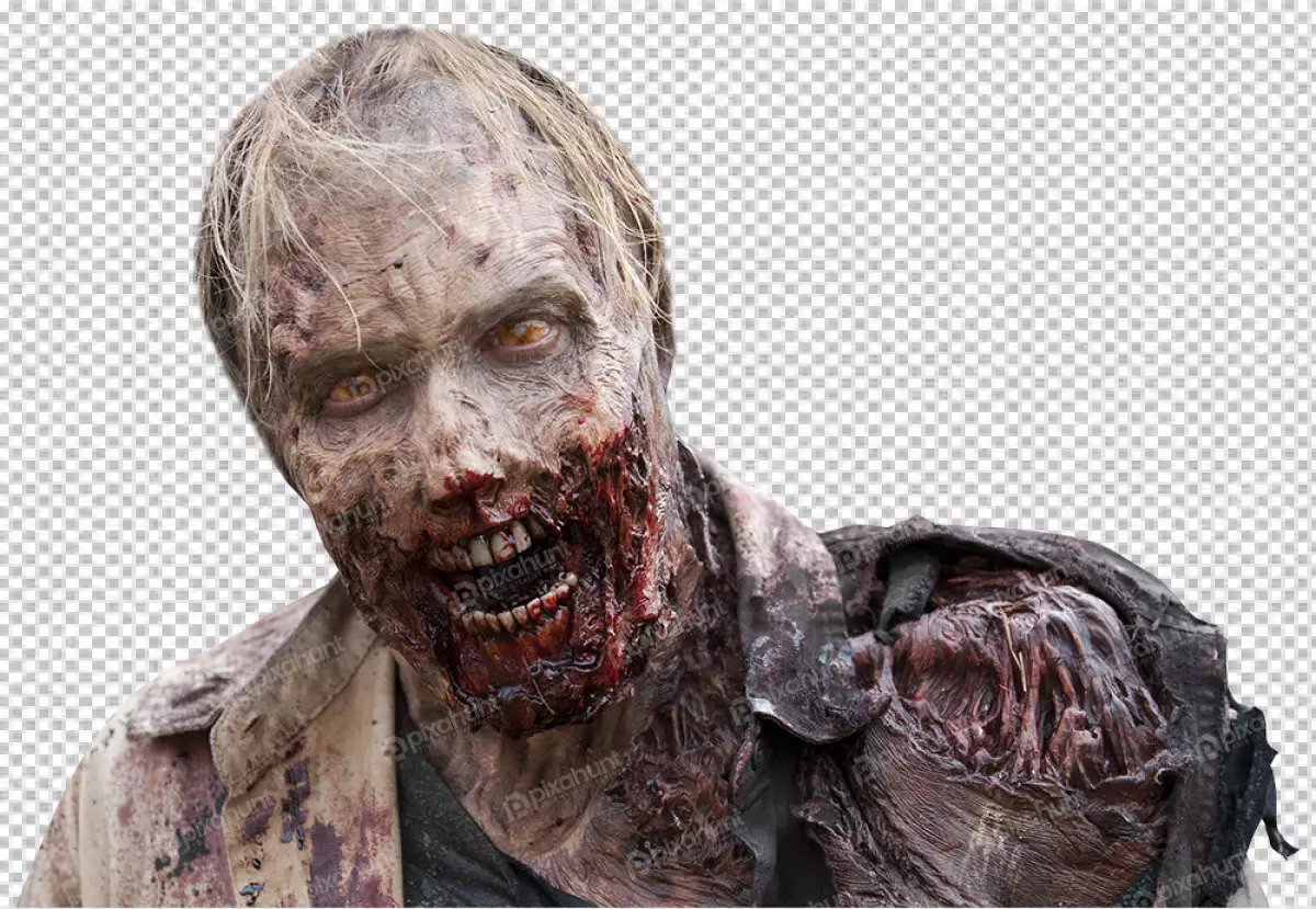Zombie eyes are wide and staring, and its skin is pale and clammy