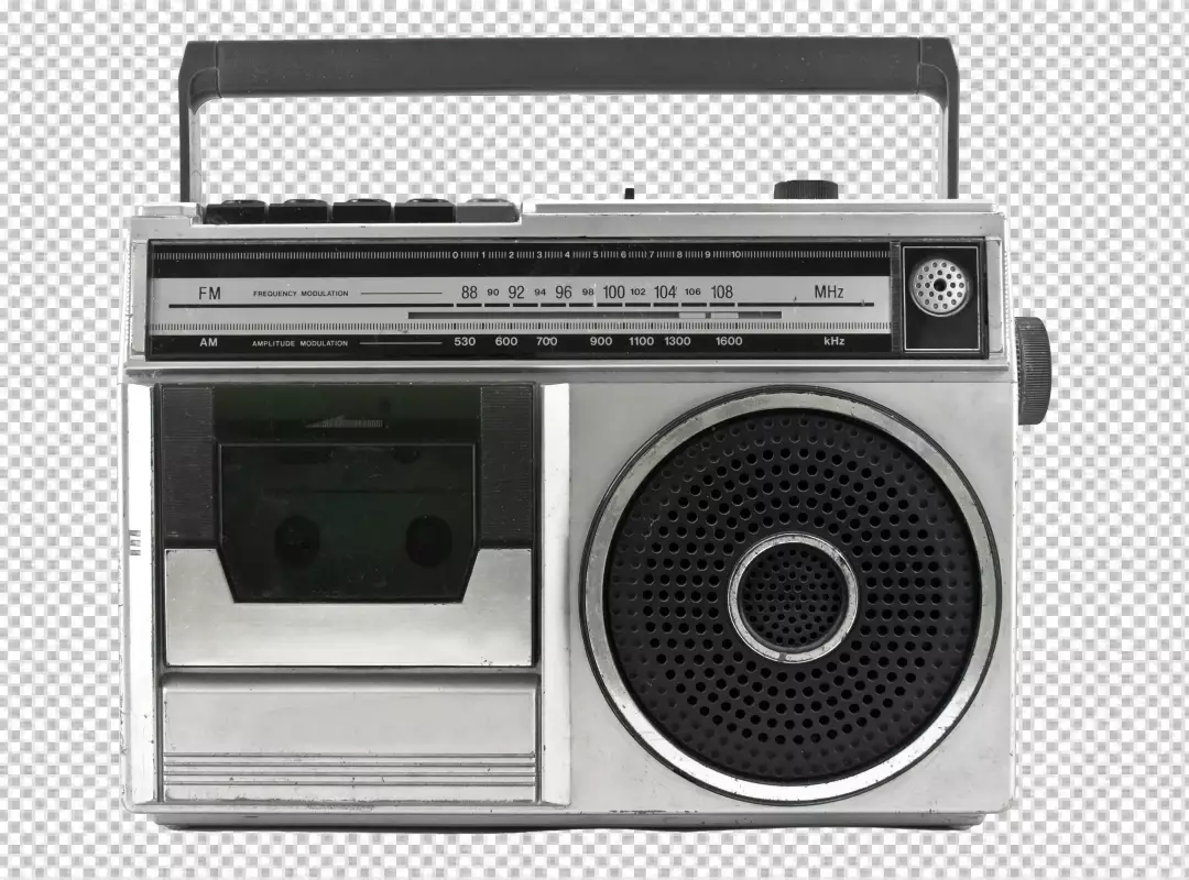 Silver retro boombox stereo cassette player boombox has a black handle on top and a black antenna on the left side
