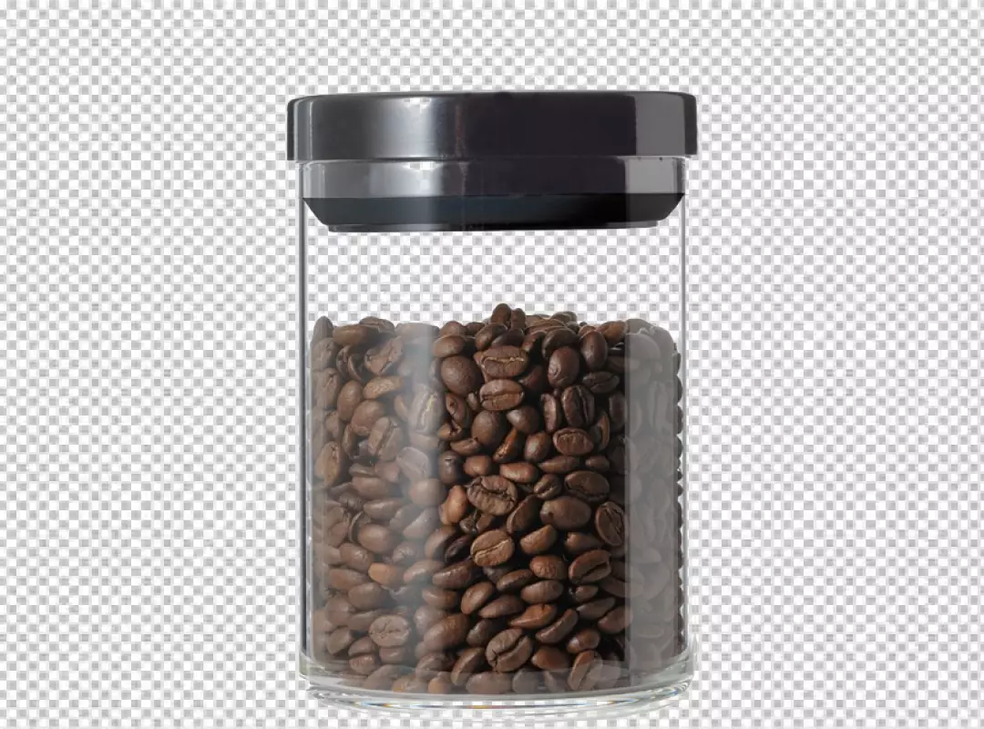 A glass jar with coffee beans and a glass jar with a few coffee beans