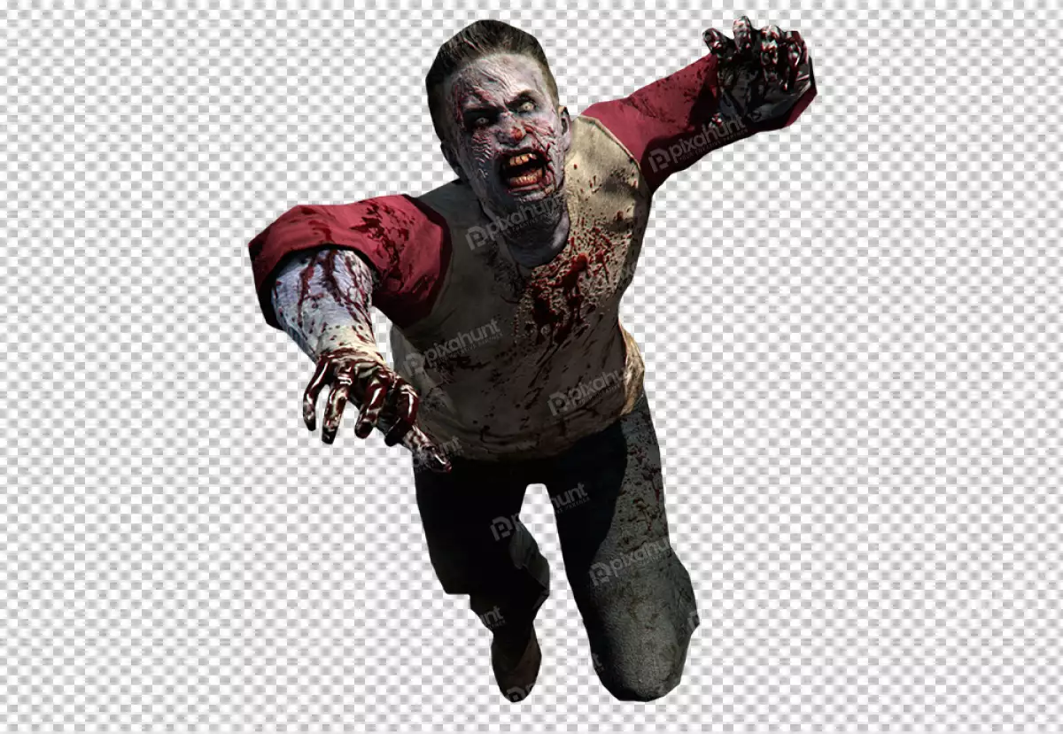 Zombie eyes are wide and staring, and its skin is pale and clammy