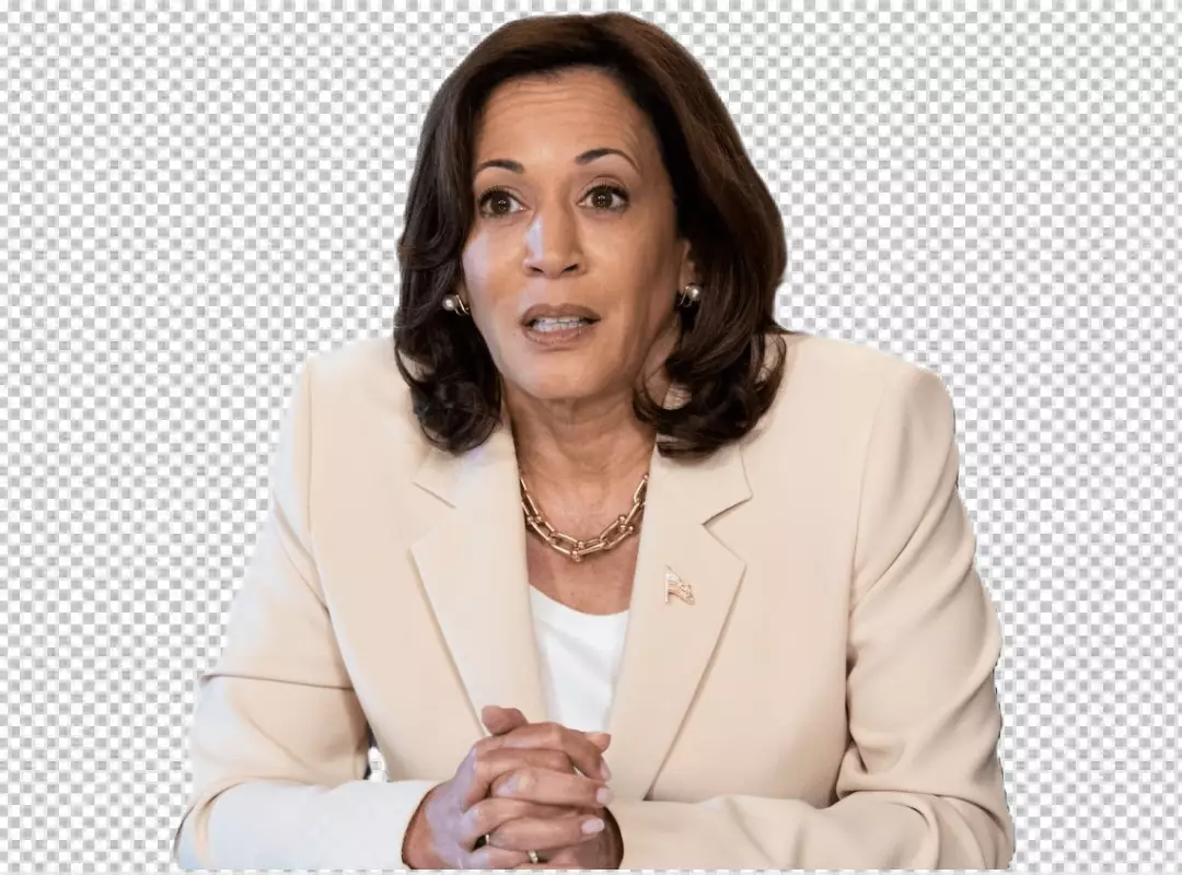 Kamala Harris is wearing a dark blue suit and a white blouse