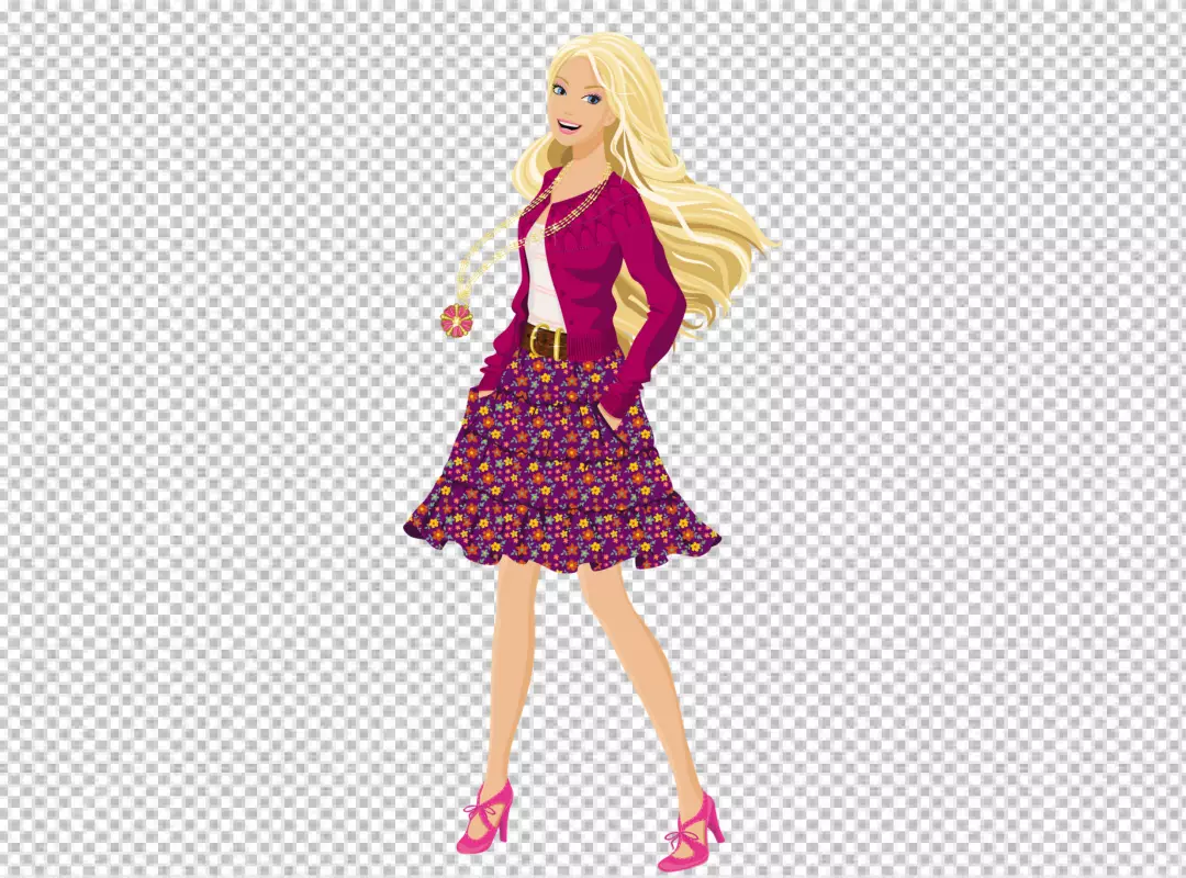 A blonde Barbie doll wearing a pink sweater, a floral skirt and pink heels also she is smiling