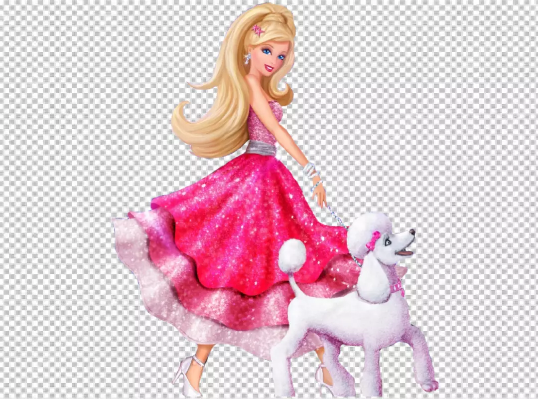 Barbie doll dressed in a vibrant sparkling pink gown posing gracefully with a white poodle companion