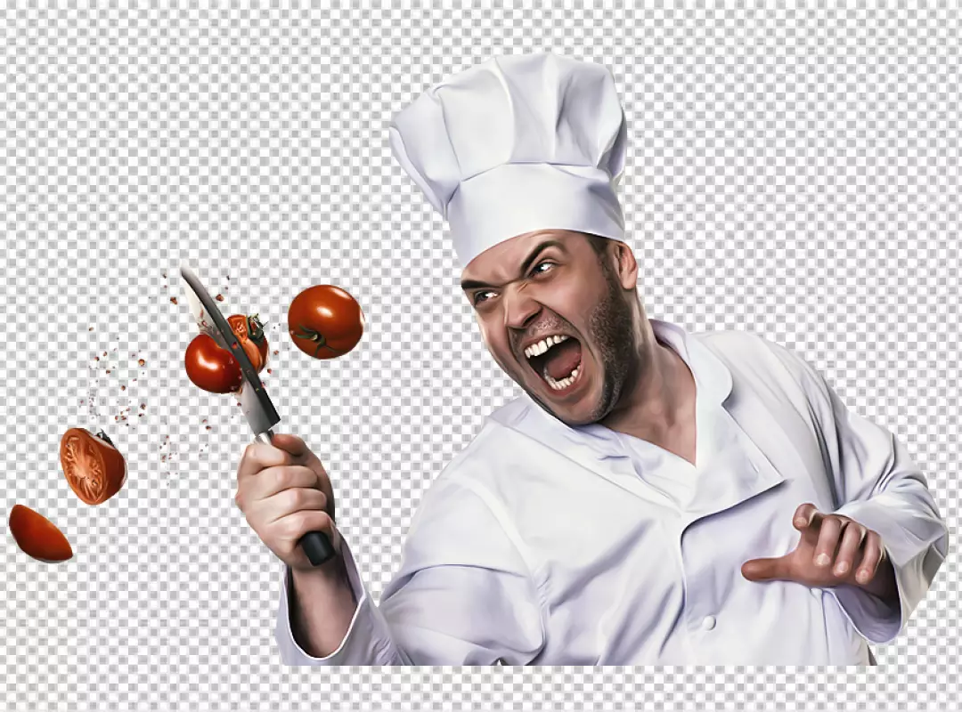A happy young bearded chef man in white uniform smiling and holding his hands together on an PNG