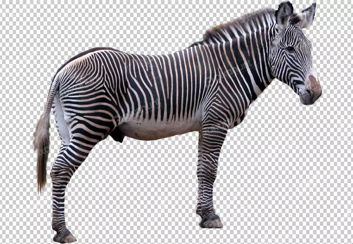 Zebra's body is facing to the left of the viewer, the head is turned slightly to the right, and the eyes are looking directly at the viewer