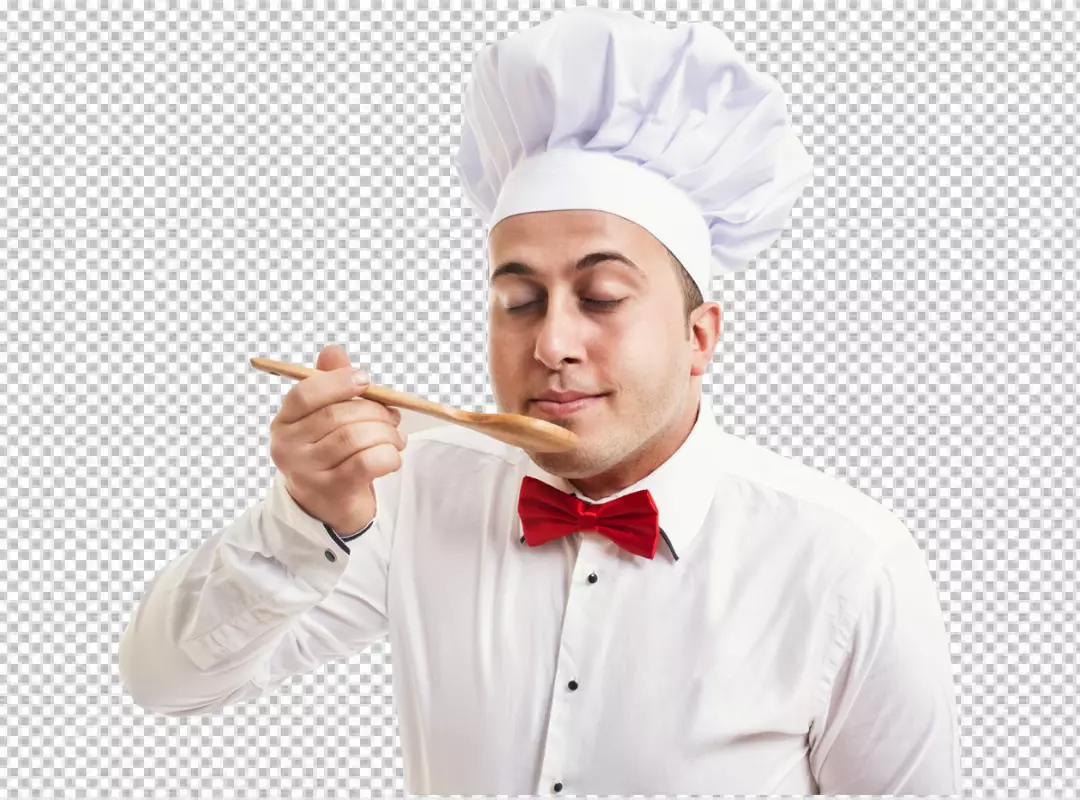 A happy young bearded chef man in white uniform smiling and holding his hands together on an PNG